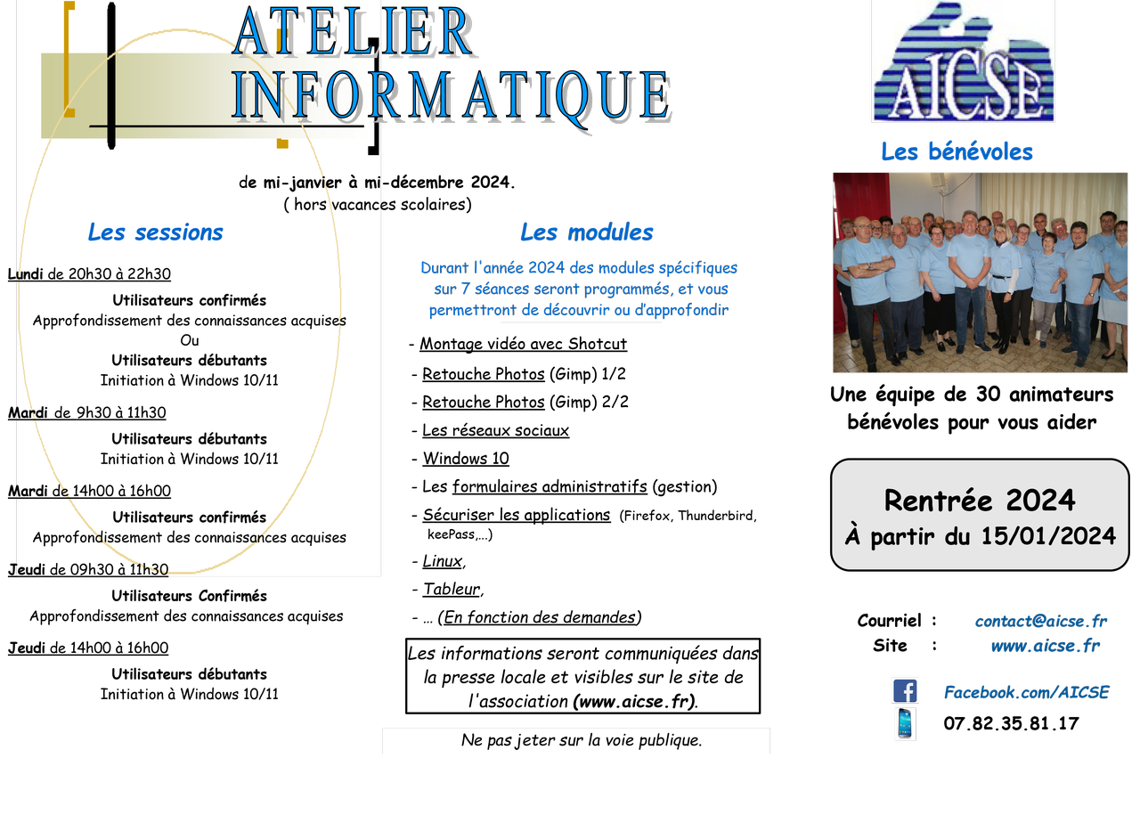 Nous vous expliquerons le programme 2024 d'initiation et de perfectionnement à l' informatiques (de janvier à décembre) avec ses nouveautés.